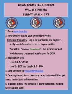 Read MoreBNSUD Registration – 2026 Season 📅 Registration Opens: March 1, 2026 🌐 Register At: www.bnsud.ca How to Register New Umpires / Not Registered in 2025 • Create a user profile on the website Returning Umpires • Log in to your profile • Confirm or update your information • Click “Register” under 2026 status Registration Fees…
