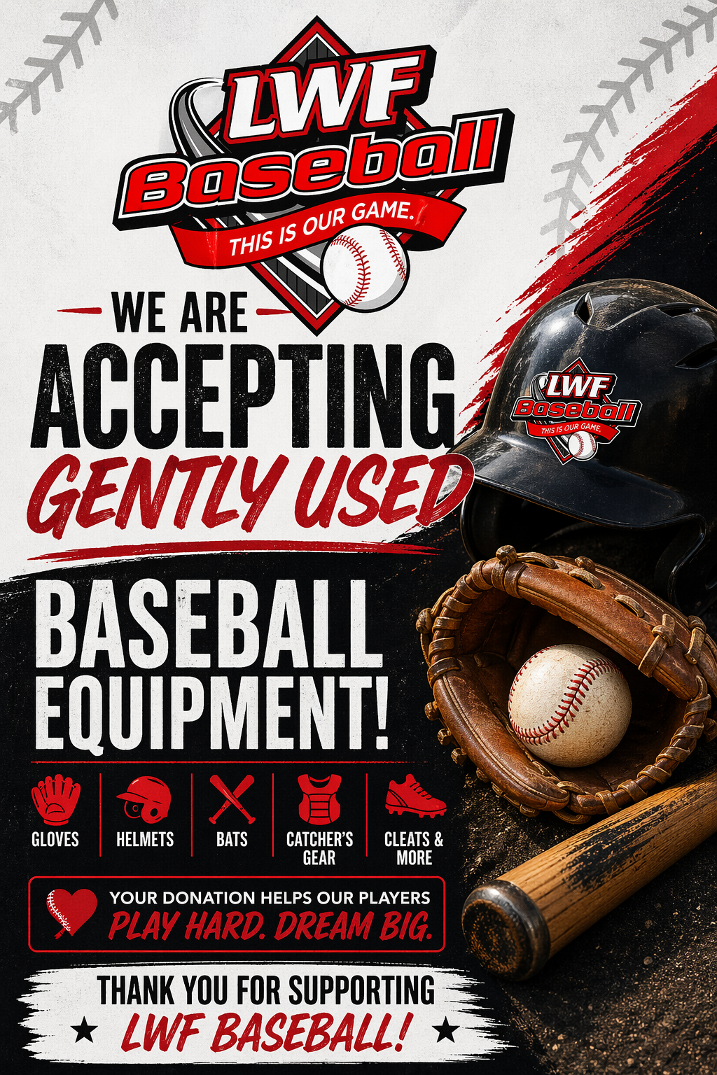 LWF Minor Baseball this year is going back to our pre-covid program of accepting gently used baseball gear which your child has grown out of so we can then hand out to players who can use it for free. While doing spring cleaning, instead of throwing out any such gear (baseball gloves, batting gloves, helmets, cleats, bats) bring it with you to the LWF Hall when we start handing out new uniforms OR feel free to drop it off at Barry’s residence on the front walkway or step – 14 Lakewood Drive in Waverley.