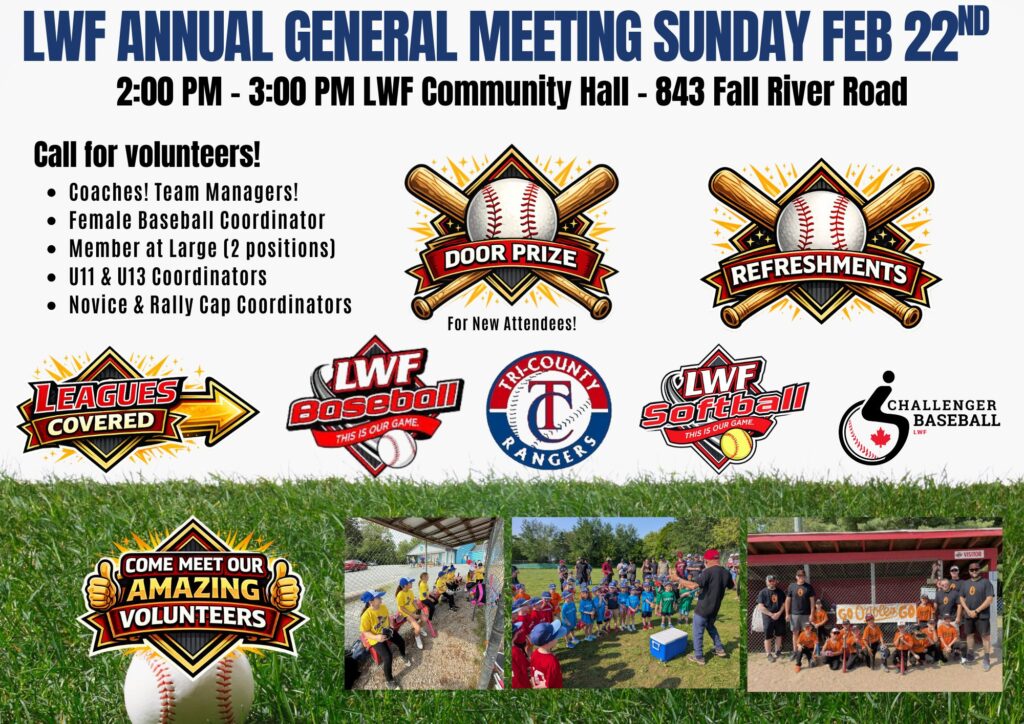 It’s that time of year!!! Our annual general meeting will be held February 22nd at 2 pm at the LWF Community Hall. We’re calling for volunteers and would love to meet new faces from our baseball and softball community. Coaches, parents, and supporters—this is for you! Volunteer roles include:• Coaches & Team Managers• Female Baseball…