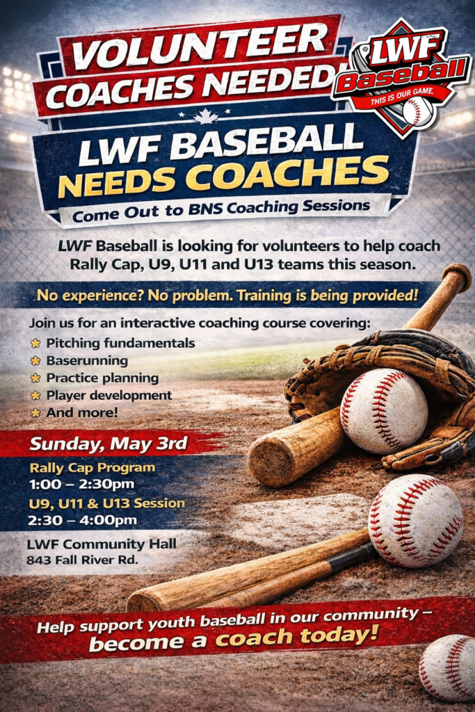 Please see the attached two posters from BNS, we have booked the upstairs at the LWF Community Hall (843 Fall River Rd) on Sunday, May 3rd for BNS folks to come and do seminars on the Rally Cap Program (6/7 yr olds) and also on Assisting Coaches for anyone interested in helping at the 9U,…